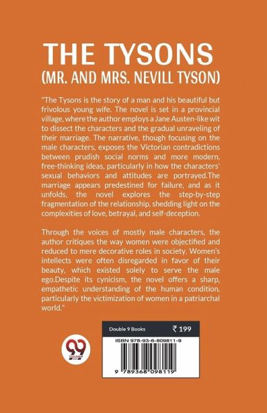 The Tysons is the story of a man and his beautiful but frivolous young wife. The novel is set in a provincial village, where the author employs a Jane Austen-like wit to dissect the characters and the gradual unraveling of their marriage. The narrative, though focusing on the male characters, exposes the Victorian contradictions between prudish social norms and more modern, free-thinking ideas, particularly in how the characters' sexual behaviors and attitudes are portrayed. The marriage appears predestined for failure, and as it unfolds, the novel explores the step-by-step fragmentation of the relationship, shedding light on the complexities of love, betrayal, and self-deception. Through the voices of mostly male characters, the author critiques the way women were objectified and reduced to mere decorative roles in society. Women's intellects were often disregarded in favor of their beauty, which existed solely to serve the male ego. Despite its cynicism, the novel offers a sharp, empathetic understanding of the human condition, particularly the victimization of women in a patriarchal world.
