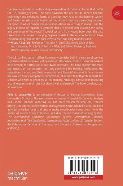 Chapter 1: Overview of the US Banking System.- Part 1: The Legal Background.- Chapter 2: Banking Laws.- Chapter 3: The Crypto-currency regulations.- Chapter 4: Anti-Money Laundering Laws.- Part 2: Actors: Regulators and Banks.- Chapter 5: The Regulators.- Chapter 6: Commercial Banks and Saving Banks.- Chapter 7: Investment Banks.- Chapter 8: Merchant Banks.- Chapter 9: Credit Union.- Chapter 10: Public Bank - Bank of North Dakota (BND).- Part 3: Risk and Bank Regulation.- Chapter 11: Risks in the Banking Industry.- Chapter 12: Banking Regulation.- Chapter 13: Banks' Capital Adequacy.- Chapter 14: Comprehensive Capital Analysis and Review (CCAR) & The Dodd-Frank Stress Testing.- Part 4: Financial Statements and Statement Analysis.- Chapter 15: Commercial Banks' Financial Statements.- Chapter 16: Commercial Bank's Financial Ratios' Analysis.- Part 5: Auditing and Bankruptcy.- Chapter 17: Bank Audit Systems.- Chapter 18: Bank Bankruptcy.