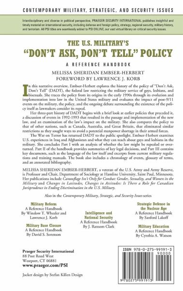 Embser-Herbert explores the history of the policy of Don't Ask, Don't Tell, (DADT) the federal law restricting the military service of gays, lesbians, and bisexuals. In this narrative overview, she traces the policy from its origins in the early 1990s, through its evolution and implementation into law in the United States military, before evaluating the impact of post-9/11 events on the military, the policy, and the ongoing debate surrounding the existence of the policy itself as lawmakers consider its repeal. Her three-part history of DADT begins with a brief look at earlier policies that preceded it, a discussion of events in 1992-1993 that resulted in the passage and implementation of the new law, and an examination of the law's impact on the military. She also compares the policy to that of other nations, such as Canada, Australia, and Great Britain, that eliminated similar restrictions as they sought ways to avoid a potential manpower shortage in their armed forces. The War on Terror has returned DADT to the public spotlight. Embser-Herbert examines U.S. experiences in Iraq and Afghanistan and what they can teach about gays and lesbians in the military. She concludes Part I with an analysis of whether the law might be repealed or overturned. Part II of the handbook provides summaries of key legal decisions, and Part III contains key documents, such as the language of the law itself and excerpts from current military regulations and training manuals.
