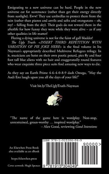 Emigrating to a new universe can be hard. People in the new universe eat for sustenance (rather than get their energy directly from sunlight). Eww! They use umbrellas to protect them from the rain (rather than pianos and anvils and safes and orangutans - oh, my! - falling from the sky). Their gods do not reward them in the afterlife for how funny they were while they were alive - as if any other qualities in life matter! Fleeing a dying universe is not for the faint of gall bladder! The Ugly Truth: is the final volume in Ira Nayman's appropriately described Multiverse Refugees trilogy. In it, musicians are hoist on their own poetic petard, pies fly and four foot tall blue aliens with no hair and exaggeratedly round features who wear exquisite three piece suits find amusing new ways to die. As they say on Earth Prime 4-6-4-0-8-9 dash Omega, "May the Audi Enz laugh upon you all the days of your life!" "The name of the game here is wordplay. Non-stop, unrestrained, groan-worthy ... inspired wordplay." - Alex Good, reviewing Good Intentions Cover artwork by Hugh Spencer
