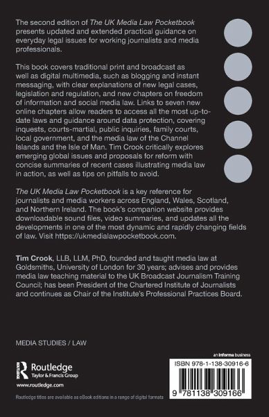 Tim Crook, LLB, LLM, PhD, founded and taught media law at Goldsmiths, University of London for 30 years; advises and provides media law teaching material to the UK Broadcast Journalism Training Council; has been President of the Chartered Institute of Journalists and continues as Chair of the Institute's Professional Practices Board.