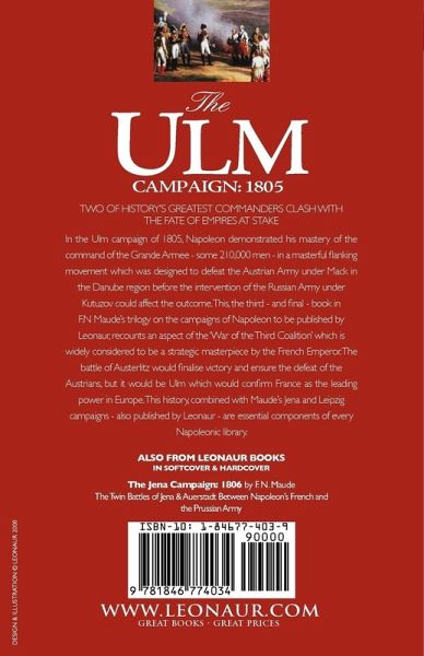 Two of history's greatest commanders clash with the fate of Empires at stake In the Ulm campaign of 1805, Napoleon demonstrated his mastery of the command of the Grande Armee-some 210,000 men-in a masterful flanking movement which was designed to defeat the Austrian Army under Mack in the Danube region before the intervention of the Russian Army under Kutuzov could affect the outcome. This, the third-and final-book in F.N Maude's trilogy on the campaigns of Napoleon to be published by Leonaur, recounts an aspect of the 'War of the Third Coalition' which is widely considered to be a strategic masterpiece by the French Emperor. The battle of Austerlitz would finalise victory and ensure the defeat of the Austrians, but it would be Ulm which would confirm France as the leading power in Europe. This history, combined with Maude's Jena and Leipzig campaigns-also published by Leonaur-are essential components of every Napoleonic library.