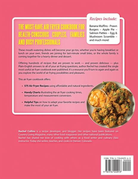 WHILE OTHER AIR FRYER COOKBOOKS are poorly written, have no recipe index, no cooking charts, lots of editing errors, incomplete instructions, plain and uninspiring recipes, or simply recipes that are overcomplicated, The Ultimate Air Fryer Cookbook by Rachel Collins features the best variety of well-thought-out and well-tested recipes you should expect with nutrition facts for every recipe in the book, comes with the well-structured recipe index and cooking charts. It includes the detailed instructions on how to use your air fryer, air fryer safety tips, how to choose the best air fryer, perfect cookbook for beginners and pro air fryer users and includes vegetarian recipes for those who are vegetarians. WE ARE REAL PEOPLE who use our own recipes for our families. We expect the best for our families and want the same for yours. The way to the hearts of your man and family is through good food on the table. Meal times can be such wonderful of times when you have the most fantastic of food on the table. We hope this cookbook will be a great help for yourself and your family. We cut no corner in our books and will cut no corners in our support of you. We know you’re a big deal and we’ll only provide you with the finest product and service around or your MONEY BACK! In The Ultimate Air Fryer Cookbook Rachel has handpicked her most-requested recipes that will surely become mainstays in your home, too. This air fryer cookbook offers: 575 Air Fryer Recipes using affordable and natural ingredients. Handy Charts illustrating the air fryer cooking times, temperature and measurement conversion. Helpful Tips on how to adapt your favorite recipes and make the most of your air fryer. "This is the first cook book in years that I feel will never make it to my bookshelf. You all know what can happen to cookbooks in bookshelves...they often remain there, only to be forgotten. Well not this time. I've already made few recipes and they did turn out amazing! I hope Rachel continues to develop recipes and I am pleased to have purchased her cookbook." —Amanda Kinsman, Writer and Editor Would You Like to Know More? Scroll to the top and Add this amazing Air Fryer Cookbook to your Cart and Get your copy NOW!