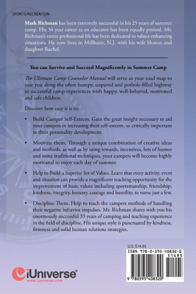 You can Survive and Succeed Magnificently in Summer Camp The Ultimate Camp Counselor Manual will serve as your road map to ease you along the often bumpy, unpaved and pothole-filled highway to successful camp experiences with happy, well-behaved, motivated and safe children. Discover how easy it is to: Build Camper Self-Esteem. Gain the great insight necessary to aid your campers in increasing their self-esteem, so critically important in their personality development. Motivate them. Through a unique combination of creative ideas and methods, as well as by using rewards, incentives, lots of humor and some traditional techniques, your campers will become highly motivated to enjoy each day of summer. Help to Build a Superior Set of Values. Learn that every activity, event and situation can provide a magnificent teaching opportunity for the improvement of basic values including sportsmanship, friendship, kindness, integrity, honesty, courage and humility, to name just a few. Discipline Them. Help to teach the campers methods of handling their negative behavior impulses. Mr. Richman shares with you his enormously successful 33 years of camping and teaching experience in the field of discipline. His unique style is punctuated by kindness, firmness and solid human relations strategies.