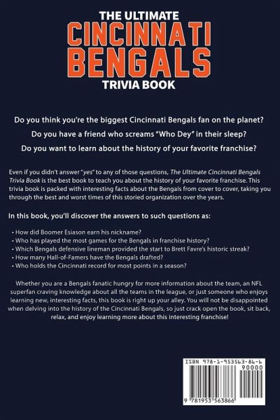 Do you think you're the biggest Cincinnati Bengals fan on the planet? Do you have a friend who screams "Who Dey" in their sleep? Do you want to learn about the history of your favorite franchise? Even if you didn't answer "yes" to any of those questions, The Ultimate Cincinnati Bengals Trivia Book is the best book to teach you about the history of your favorite franchise. This trivia book is packed with interesting facts about the Bengals from cover to cover, taking you through the best and worst times of this storied organization over the years. In this book, you'll discover the answers to such questions as:How did Boomer Esiason earn his nickname? Who has played the most games for the Bengals in franchise history? Which Bengals defensive lineman provided the start to Brett Favre's historic streak? How many Hall-of-Famers have the Bengals drafted? Who holds the Cincinnati record for most points in a season? Whether you are a Bengals fanatic hungry for more information about the team, an NFL superfan craving knowledge about all the teams in the league, or just someone who enjoys learning new, interesting facts, this book is right up your alley. You will not be disappointed when delving into the history of the Cincinnati Bengals, so just crack open the book, sit back, relax, and enjoy learning more about this interesting franchise!