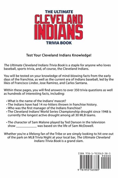 Test Your Cleveland Indians Knowledge! The Ultimate Cleveland Indians Trivia Book is a staple for anyone who loves baseball, sports trivia, and, of course, the Cleveland Indians. You will be tested on your knowledge of mind-blowing facts from the early days of the franchise, as well as the current era of Indians baseball, led by the likes of Francisco Lindor, Jose Ramirez, and Carlos Santana. Within these pages, you will find answers to over 350 trivia questions as well as hundreds of interesting facts, including: What is the name of the Indians' mascot? The Indians have had 14 no-hitters thrown in franchise history. Who was the first manager of the Indians franchise? The Cleveland Indians' World Series Championship drought since 1948 is currently the longest active drought among all 30 MLB teams. The character of Sam Malone played by Ted Danson in the television show ____________ was based on the life of Sam McDowell. Whether you're a lifelong fan of the Tribe or are simply looking to hit one out of the park on MLB Trivia Night at your local bar, The Ultimate Cleveland Indians Trivia Book is a grand slam.