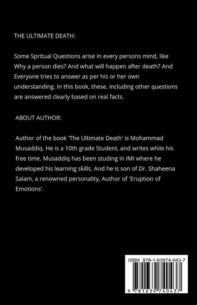 The Ultimate Death is for everybody, especially for those who develop some questions about death in their minds. This book is composed of some brief Reality-based basics of every religion and faith. Some questions and religious descriptions are framed in every chapter. This is a brief outline of the fact, 'what will happen after death?'. Mystical Questions are answered in a positive and general way. Many scripts and Present sayings are given to prove the fact. In the end, powerful and Motivational Quotes about death are given. This book may provide a special skill to identify the goal of one's life and what is the purpose of being alive.