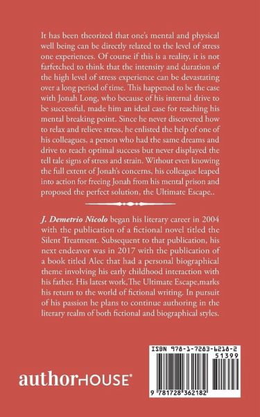 It has been theorized that one's mental and physical well being can be directly related to the level of stress one experiences. Of course if this is a reality, it is not farfetched to think that the intensity and duration of the high level of stress experience can be devastating over a long period of time. This happened to be the case with Jonah Long, who because of his internal drive to be successful, made him an ideal case for reaching his mental breaking point. Since he never discovered how to relax and relieve stress, he enlisted the help of one of his colleagues, a person who had the same dreams and drive to reach optimal success but never displayed the tell tale signs of stress and strain. Without even knowing the full extent of Jonah's concerns, his colleague leaped into action for freeing Jonah from his mental prison and proposed the perfect solution, the Ultimate Escape..