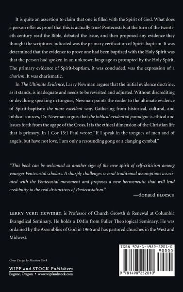 It is quite an assertion to claim that one is filled with the Spirit of God. What does a person offer as proof that this is actually true? Pentecostals at the turn of the twentieth century read the Bible, debated the issue, and then proposed an evidence they thought the scriptures indicated was the primary verification of Spirit-baptism. It was determined that the evidence to prove one had been baptized with the Holy Spirit was that the person had spoken in an unknown language as prompted by the Holy Spirit. The primary evidence of Spirit-baptism, it was concluded, was the expression of a charism. It was charismatic. In The Ultimate Evidence, Larry Newman argues that the initial evidence doctrine, as it stands, is inadequate and needs to be revisited and adjusted. Without discrediting or devaluing speaking in tongues, Newman points the reader to the ultimate evidence of Spirit-baptism: the more excellent way. Gathering from historical, cultural, and biblical sources, Dr. Newman argues that the biblical evidential paradigm is ethical and issues forth from the agape of the Cross. It is the ethical dimension of the Christian life that is primary. In 1 Cor 13:1 Paul wrote: ""If I speak in the tongues of men and of angels, but have not love, I am only a resounding gong or a clanging cymbal.""
