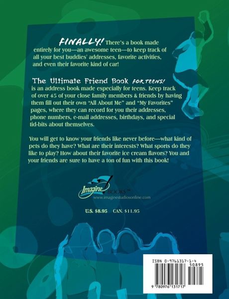 Finally! There's a book made entirely for you-an awesome teen-to keep track of all your best buddies' addresses, favorite activities, and even their favorite kind of car! The Ultimate Friend Book For Teens! is an address book made especially for teens. Keep track of over 45 of your close family members & friends by having them fill out their own "All About Me" and "My Favorites" pages, where they can record for you their addresses, phone numbers, e-mail addresses, birthdays, and special tid-bits about themselves. You will get to know your friends like never before-what kind of pets do they have? What are their interests? What sports do they like to play? How about their favorite ice cream flavors? You and your friends are sure to have a ton of fun with this book!