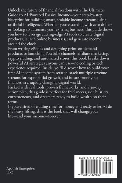 Unlock the future of financial freedom with The Ultimate Guide to AI-Powered Passive Income-your step-by-step blueprint for building smart, scalable income streams using artificial intelligence. Whether you're starting with zero dollars or looking to automate your existing business, this guide shows you how to leverage cutting-edge AI tools to create digital products, launch online businesses, and generate income around the clock. From writing eBooks and designing print-on-demand products to launching YouTube channels, affiliate marketing, crypto trading, and automated stores, this book breaks down powerful AI strategies anyone can use-no coding or tech experience required. Inside, you'll discover how to build your first AI income system from scratch, stack multiple revenue streams for exponential growth, and future-proof your finances in a rapidly changing digital world. Packed with real tools, proven frameworks, and a 30-day action plan, this guide is perfect for freelancers, side hustlers, entrepreneurs, and dreamers ready to build wealth on their terms. If you're tired of trading time for money and ready to let AI do the heavy lifting, this is the book that will change your life-and your income-forever.