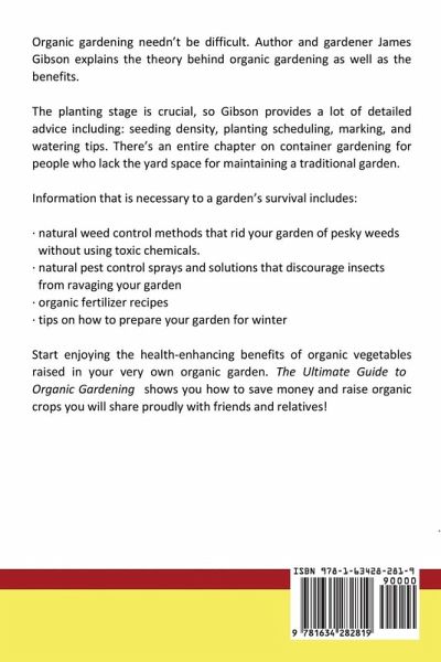 James Gibson shows you how to save money and raise organic crops you will share proudly with friends and relatives! Organic gardening needn't be difficult. In fact, it can be downright fascinating and rewarding, especially if you start out on the right foot. Gardener and landscaper, James Gibson, has accumulated a lot of organic gardening wisdom over the years, and he helpfully breaks it all down for you--translating complex ideas into simple, easy to follow advice that will transform you into a veteran organic gardener before you know it! You won't need a college degree in science or agriculture to understand Gibson's organic gardening theory or his explanation of the benefits of organic gardening. Once he is finished discussing theory, he shifts straight the planning and process--choosing the right location, size, and layout of your garden. Once your gardening plan is completed, Gibson tells you how to test your soil's PH levels and its percentage of organic matter. The planting stage is crucial, so Gibson provides a lot of detailed advice including: seeding density, planting scheduling, marking, and watering tips. For those who prefer alternatives to a regular garden--there's an entire chapter on container gardening for people who lack the yard space for maintaining a traditional garden. Did you know that you can even grow a garden without soil? To help you, Gibson provides a bountiful trove of advice on how to grow a hydroponic garden. Gibson also includes information that is necessary to a garden's survival, including: o natural weed control methods that rid your garden of pesky weeds without using toxic chemicals. o natural pest control sprays and solutions that discourage insects from ravaging your garden o organic fertilizer recipes o tips on how to prepare your garden for winter Start enjoying the health-enhancing benefits of organic vegetables raised in your very own organic garden. The Ultimate Guide to Organic Gardening will show you the way!