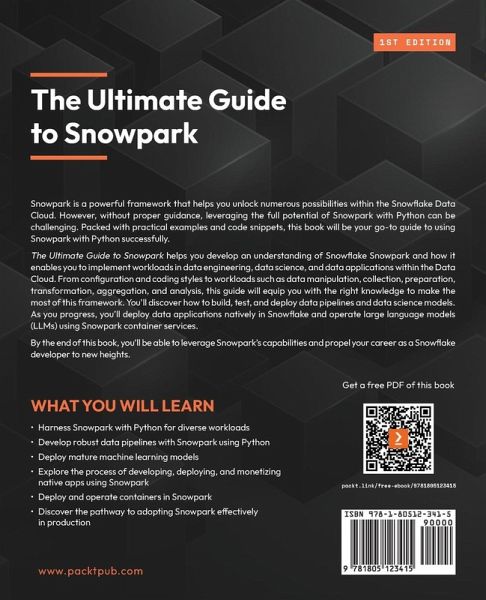 Develop robust data pipelines, deploy mature machine learning models, and build secure data apps with Snowflake Snowpark using Python Key Features - Get to grips with Snowflake Snowpark's basic and advanced features - Implement workloads in domains like data engineering, data science, and data applications using Snowpark with Python - Deploy Snowpark in production with practical examples and best practices - Purchase of the print or Kindle book includes a free PDF eBook Book Description Snowpark is a powerful framework that helps you unlock numerous possibilities within the Snowflake Data Cloud. However, without proper guidance, leveraging the full potential of Snowpark with Python can be challenging. Packed with practical examples and code snippets, this book will be your go-to guide to using Snowpark with Python successfully. The Ultimate Guide to Snowpark helps you develop an understanding of Snowflake Snowpark and how it enables you to implement workloads in data engineering, data science, and data applications within the Data Cloud. From configuration and coding styles to workloads such as data manipulation, collection, preparation, transformation, aggregation, and analysis, this guide will equip you with the right knowledge to make the most of this framework. You'll discover how to build, test, and deploy data pipelines and data science models. As you progress, you'll deploy data applications natively in Snowflake and operate large language models (LLMs) using Snowpark container services. By the end of this book, you'll be able to leverage Snowpark's capabilities and propel your career as a Snowflake developer to new heights. What you will learn - Harness Snowpark with Python for diverse workloads - Develop robust data pipelines with Snowpark using Python - Deploy mature machine learning models - Explore the process of developing, deploying, and monetizing native apps using Snowpark - Deploy and operate containers in Snowpark - Discover the pathway to adopting Snowpark effectively in production Who this book is for This book is for data engineers, data scientists, developers, and data practitioners seeking an in-depth understanding of Snowpark's features and best practices for deploying various workloads in Snowpark using the Python programming language. Basic knowledge of SQL, proficiency in Python, an understanding of data engineering and data science basics, and familiarity with the Snowflake Data Cloud platform are required to get the most out of this book. Table of Contents - Discovering Snowpark - Establishing a Foundation with Snowpark - Simplifying Data Processing Using Snowpark - Building Data Engineering Pipelines with Snowpark - Developing Data Science Projects with Snowpark - Deploying and Managing ML Models with Snowpark - Developing a Native Application with Snowpark - Introduction to Snowpark Container Services