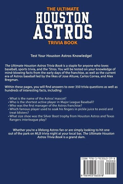 Test Your Houston Astros Knowledge! The Ultimate Houston Astros Trivia Book is a staple for anyone who loves baseball, sports trivia, and the 'Stros. You will be tested on your knowledge of mind-blowing facts from the early days of the franchise, as well as the current era of Astros baseball led by the likes of Jose Altuve, Carlos Correa, and Alex Bregman. Within these pages, you will find answers to over 350 trivia questions as well as hundreds of interesting facts, including: What is the name of the Astros' mascot? Who is the shortest active player in Major League Baseball? Who was the first manager of the Astros franchise? Which famous player used to soak his fingers in pickle juice to avoid and treat blisters? What size shoe was the Silver Boot trophy from Houston Astros and Texas Rangers interleague play? Whether you're a lifelong Astros fan or are simply looking to hit one out of the park on MLB trivia night at your local bar, The Ultimate Houston Astros Trivia Book is a grand slam.