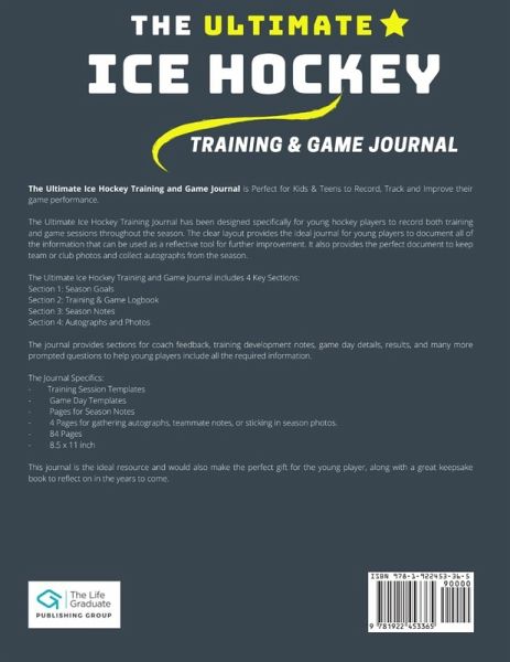 The Ultimate Ice Hockey Training and Game Journal is Perfect for Kids & Teens to Record, Track and improve their game performance. The Ultimate Ice Hockey Sports Journal has been designed specifically for young hockey players to record both training and game sessions throughout the season. The clear layout provides the ideal journal for young players to document all of the information that can be used as a reflective tool for further improvement. It also provides the perfect document to keep team or club photos and collect autographs from the season. The Ultimate Ice Hockey Training and Game Journal includes 4 Key Sections: Section 1: Season Goals Section 2: Training & Game Logbook Section 3: Season Notes Section 4: Autographs and Photos The journal provides sections for coach feedback, training development notes, game day details, results, and many more prompted questions to help young players include all the required information. The Journal Specifics: - 84 Pages - 8.5 x 11 inch - Training Session Templates - Game Day Templates - Pages for Season Notes - 4 Pages for gathering autographs, teammate notes, or sticking in season photos. This journal is the ideal resource and would also make the perfect gift for the young player, along with a great keepsake book to reflect on in the years to come.
