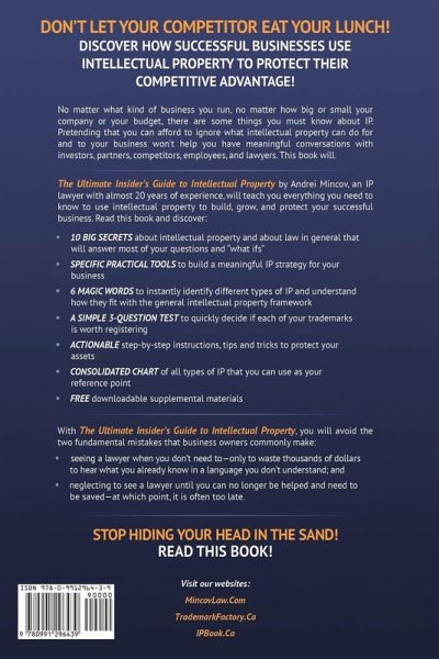 DON'T LET YOUR COMPETITOR EAT YOUR LUNCH! DISCOVER HOW SUCCESSFUL BUSINESSES USE INTELLECTUAL PROPERTY TO PROTECT THEIR COMPETITIVE ADVANTAGE! No matter what kind of business you run, no matter how big or small your company or your budget, there are some things you must know about IP. Pretending that you can afford to ignore what intellectual property can do for and to your business won't help you have meaningful conversations with investors, partners, competitors, employees, and lawyers. This book will. THE ULTIMATE INSIDER'S GUIDE TO INTELLECTUAL PROPERTY by Andrei Mincov, an IP Lawyer with almost 20 years of experience, will teach you everything you need to know to use intellectual property to build, grow, and protect your successful business. Read this book and discover: ¿ 10 BIG SECRETS about intellectual property and about law in general that will answer most of your questions and "what ifs" ¿ SPECIFIC PRACTICAL TOOLS to build a meaningful IP strategy for your business ¿ 6 MAGIC WORDS to instantly identify different types of IP and understand how they fit with the general intellectual property framework ¿ A SIMPLE 3-QUESTION TEST to quickly decide if each of your trademarks is worth registering ¿ ACTIONABLE step by step instructions, tips and tricks to protect your assets ¿ CONSOLIDATED CHART of all types of IP that you can use as your reference point ¿ FREE downloadable supplemental materials With The Ultimate Insider's Guide To Intellectual Property, you will avoid the two fundamental mistakes that business owners commonly make: ¿ seeing a lawyer when you don't need to-only to waste thousands of dollars to hear what you already know in a language you don't understand; and ¿ neglecting to see a lawyer until you can no longer be helped and need to be saved-at which point, it is often too late. STOP HIDING YOUR HEAD IN THE SAND! READ THIS BOOK!