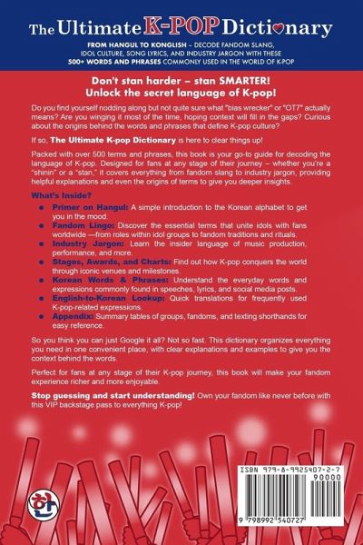 Don't stan harder - stan SMARTER! Unlock the secret language of K-pop! Do you find yourself nodding along but not quite sure what "bias wrecker" or "OT7" actually means? Are you winging it most of the time, hoping context will fill in the gaps? Curious about the origins behind the words and phrases that define K-pop culture? If so, The Ultimate K-pop Dictionary is here to clear things up! Packed with over 500 terms and phrases, this book is your go-to guide for decoding the language of K-pop. Designed for fans at any stage of their journey - whether you're a "shinin" or a "stan," it covers everything from fandom slang to industry jargon, providing helpful explanations and even the origins of terms to give you deeper insights.What's Inside?Primer on Hangul: A simple introduction to the Korean alphabet to get you in the mood. Fandom Lingo: Discover the essential terms that unite idols with fans worldwide -from roles within idol groups to fandom traditions and rituals. Industry Jargon: Learn the insider language of music production, performance, and more. Stages, Awards, and Charts: Find out how K-pop conquers the world through iconic venues and milestones. Korean Words & Phrases: Understand the everyday words and expressions commonly found in speeches, lyrics, and social media posts. English-to-Korean Lookup: Quick translations for frequently used K-pop-related expressions. Appendix: Summary tables of groups, fandoms, and texting shorthands for easy reference. Perfect for fans at any stage of their K-pop journey, this book will make your fandom experience richer and more enjoyable.