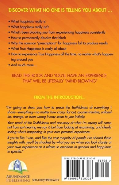 Do you want to know how to be happy, all the time, no matter what's going on around you? Sure you do. But before you can experience that, you must be able to answer 2 questions: What is happiness ... really? How can you get from where you are now into that Experience? The Ultimate Key To Happiness will offer unusual answers to you. Through the pages of this book, yoüll discover what no one has been telling you about: What happiness really is (hint: it's not what you were taught) What happiness really isn't What's been blocking you from experiencing happiness consistently How to dissolve that block Why the common "prescriptions" for happiness fail to produce results The exact steps you can take to experience True Happiness, all the time, no matter what¿s going on around you And much more ... Through the pages of this book, yoüll discover why happiness has remained so elusive, despite how badly you want it, how hard yoüve tried to experience it, and the promises made to you by experts and gurus. The happiness yoüve been seeking has been hiding in plain sight all along. Through what this book sets into motion, yoüll finally be able to see it, grasp it, and integrate it permanently into your Being. Odds are, what yoüll discover in this book will surprise you, shock you, rock your world, and literally blow your ¿mind.¿