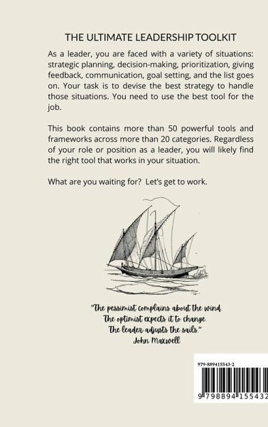 As a leader you may be presented with a variety of situations - from decision-making, to strategic planning, to giving feedback to your teams. To be effective in your role as a leader, you need to know which tools and frameworks to use based on the situation. The Ultimate Leadership Toolkit summarizes more than 50 essential leadership frameworks across 20+ categories. This book equips you with the tools and resources to be effective in your role as a leader. How to use this book: This is your leadership toolkit. Keep it handy, refer to it often, and use the tools in your work regularly. You can also read it from cover to cover. Whatever works best for you.