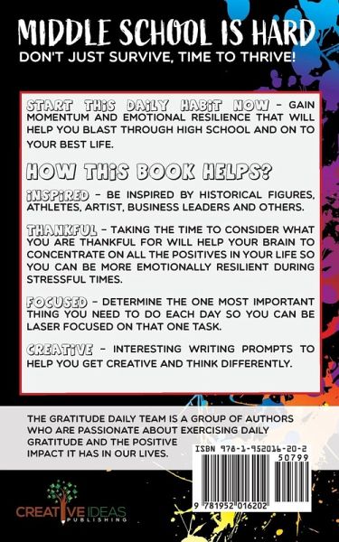 Middle School is Hard Benefit from this daily habit - gain momentum and emotional resilience that will help you blast through high school and on to your best life. HOW THIS BOOK HELPS? INSPIRED - Be inspired by historical figures, athletes, artist, business leaders and others. THANKFUL - Taking the time to consider what you are thankful for will help your brain to concentrate on all the positives in your life so you can be more emotionally resilient during stressful times. FOCUSED - Determine the one most important thing you need to do each day so you can be laser focused on that one task. CREATIVE - Interesting writing prompts to help you get creative and think differently. WHY GRATITUDE MATTERS? BOOST HAPPINESS - Research shows that journaling about what you are grateful for can increase your long-term happiness. INCREASE YOUR SELF-ESTEEM -Gratitude can help your child feel better about their circumstances which can lead them to feeling better about themselves. IMPROVE YOUR OVERALL HEALTH - Research shows that the more grateful a person is the more likely they are to take care of themselves. BOOK SPECS SIZE: 5" x 8" - Perfect size to easily fit in a bookbag or endtable. (127mm x 203mm) PAGE COUNT: 104 pages PAGE COLOR: Cover has a cool matte finish and full color print. Interior pages are black and white so we can offer a great price. PAGE DESIGN: Inspirational quote, Gratitude section, the "one thing" section and creative thinking prompt on each page. GREAT RESOURCE For teachers and parents - This book can serve as part of your "toolkit" to help your child or student. Being in Middle School can be stressful and cause anxiety. Daily gratitude and reflection can help better prepare your child emotionally when anxiety hits. Being able to focus on all the positive parts of life is an excellent coping skill that will serve your child for life. Categories: Middle School Gratitude journal, gratitude journal for middle schoolers, gratitude journal for girls, daily gratitude journal, adolescent gratitude journal, middle school cbt, middle school coping skills, coping skills for kids "