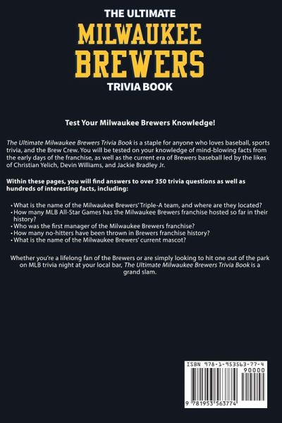 Test Your Milwaukee Brewers Knowledge! The Ultimate Milwaukee Brewers Trivia Book is a staple for anyone who loves baseball, sports trivia, and the Brew Crew. You will be tested on your knowledge of mind-blowing facts from the early days of the franchise, as well as the current era of Brewers baseball led by the likes of Christian Yelich, Devin Williams, and Jackie Bradley Jr. Within these pages, you will find answers to over 350 trivia questions as well as hundreds of interesting facts, including: What is the name of the Milwaukee Brewers' Triple-A team, and where are they located? How many MLB All-Star Games has the Milwaukee Brewers franchise hosted so far in their history? Who was the first manager of the Milwaukee Brewers franchise? How many no-hitters have been thrown in Brewers franchise history? What is the name of the Milwaukee Brewers' current mascot? Whether you're a lifelong fan of the Brewers or are simply looking to hit one out of the park on MLB trivia night at your local bar, The Ultimate Milwaukee Brewers Trivia Book is a grand slam.
