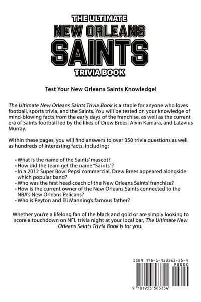 Test Your New Orleans Saints Knowledge! The Ultimate New Orleans Saints Trivia Book is a staple for anyone who loves football, sports trivia, and the Saints. You will be tested on your knowledge of mind-blowing facts from the early days of the franchise, as well as the current era of Saints football led by the likes of Drew Brees, Alvin Kamara, and Latavius Murray. Within these pages, you will find answers to over 350 trivia questions as well as hundreds of interesting facts, including: What is the name of the Saints' mascot? How did the team get the name "Saints"? In a 2012 Super Bowl Pepsi commercial, Drew Brees appeared alongside which popular band? Who was the first head coach of the New Orleans Saints' franchise? How is the current owner of the New Orleans Saints connected to the NBA's New Orleans Pelicans? Who is Peyton and Eli Manning's famous father? Whether you're a lifelong fan of the black and gold or are simply looking to score a touchdown on NFL trivia night at your local bar, The Ultimate New Orleans Saints Trivia Book is for you,