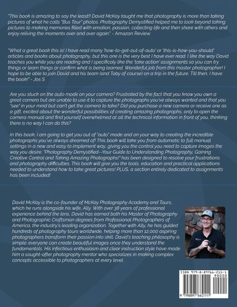Are you stuck on the auto mode of your camera? Feeling frustrated because you know you own a great camera, but are unable to use it to capture the photographs you've always envisioned? Did you purchase a new camera or receive one as a gift, excited about the wonderful possibilities of creating amazing photographs, only to open the camera manual and find yourself overwhelmed by all the technical information in front of you, thinking "there's no way I can do this"? In this book, I will get you out of "auto" mode and on your way to creating the incredible photographs you've always dreamed of! This book will empower you to transition from automatic to full manual settings in a new, easy-to-implement way, giving you the control you need to capture images the way you desire. "Photography Demystified - Your ULTIMATE Guide to Understanding Photography, Gaining Creative Control, and Taking Amazing Photographs!" has been designed to resolve your frustrations and photography difficulties. This book will give you the tools, education, and practical applications needed to understand how to take great pictures! It also includes a dedicated section for photography assignments, downloadable exposure guides, and quick reference tips to support you every step of the way. The first books in my series came onto the scene in 2016, earning over 1,000 glowing 5-star reviews. But I did not stop there! This latest installment takes it to the next level. I have not only updated the information to keep pace with the latest technology but carefully curated the best content from my previous books. The result? One ultimate, powerhouse guide that gives you everything you need, all in one place. Get ready for the most comprehensive and streamlined experience yet! Having earned my Master of Photography and Photographic Craftsmen degrees from Professional Photographers of America, the leading photography organization in the world, I have been a full-time professional photographer for over thirty-five years. Along with my wife Ally, I own McKay Photography Academy and the online community Photo Enthusiast Network. We have led hundreds of photographic tours around the world, teaching over twelve thousand people-just like you-how to excel in photography. I am passionate about teaching others how to achieve excellent results in their photography. My motivation is to make photography accessible and enjoyable for everyone, taking the frustration out of the process! Beginning photographers, camera buffs, photo enthusiasts, and many others who struggle with understanding photography concepts, exposure, and their camera manuals have already experienced my proven methods of teaching beginner's photography. This book will do the same for you, demystifying the technical jargon and giving you the confidence to unleash your creativity. So why wait? Let's get started on your photography journey today!