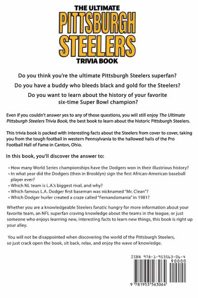 Do you think you're the ultimate Pittsburgh Steelers superfan? Do you have a buddy who bleeds black and gold for the Steelers? Do you want to learn about the history of your favorite six-time Super Bowl champion? Even if you couldn't answer yes to any of those questions, you will still enjoy The Ultimate Pittsburgh Steelers Trivia Book, the best book to learn about the historic Pittsburgh Steelers. This trivia book is packed with interesting facts about the Steelers from cover to cover, taking you from the tough football in western Pennsylvania to the hallowed halls of the Pro Football Hall of Fame in Canton, Ohio. In this book, you'll discover the answer to:Which team combined with the Steelers during World War II to create a new team? How many Hall-of-Famers did the Steelers draft in 1974? Which Pittsburgh receiver was coached by Snoop Dogg in a youth football league? Which Pittsburgh draft pick won six collegiate national titles as a wrestler? Who was the youngest quarterback to start and win a Super Bowl? Whether you are a knowledgeable Steelers fanatic hungry for more information about your favorite team, an NFL superfan craving knowledge about the teams in the league, or just someone who enjoys learning new, interesting facts to learn new things, this book is right up your alley. You will not be disappointed when discovering the world of the Pittsburgh Steelers, so just crack open the book, sit back, relax, and enjoy the wave of knowledge.