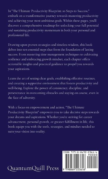 In "The Ultimate Productivity Blueprint: 10 Steps to Success," embark on a transformative journey towards mastering productivity and achieving your most ambitious goals. Within these pages, you'll discover a comprehensive roadmap for unlocking your full potential and sustaining productivity momentum in both your personal and professional life. Drawing upon proven strategies and timeless wisdom, this book delves into ten essential steps that form the foundation of lasting success. From mastering time management techniques to cultivating resilience and embracing growth mindset, each chapter offers actionable insights and practical guidance to propel you towards your aspirations. Learn the art of setting clear goals, establishing effective routines, and creating a supportive environment that fosters productivity and well-being. Explore the power of consistency, discipline, and perseverance in overcoming obstacles and staying on course, even in the face of adversity. With a focus on empowerment and action, "The Ultimate Productivity Blueprint" empowers you to take decisive steps towards your dreams and aspirations. Whether you're striving for career advancement, personal growth, or greater fulfillment in life, this book equips you with the tools, strategies, and mindset needed to turn your vision into reality. If you're ready to unlock your full potential, maximize your productivity, and achieve lasting success, "The Ultimate Productivity Blueprint" is your guide to mastering the art of productivity and transforming your life.