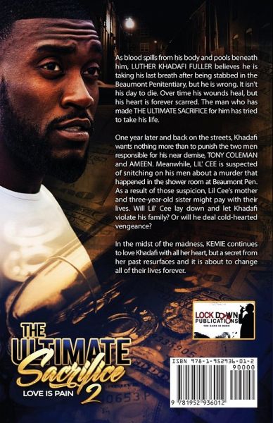 As blood spills from his body and pools beneath him, LUTHER KHADAFI FULLER believes he is taking his last breath after being stabbed in the Beaumont Penitentiary, but he is wrong. It isn't his day to die. Over time his wounds heal, but his heart is forever scarred. The man who has made THE ULTIMATE SACRIFICE for him has tried to take his life. One year later and back on the streets, Khadafi wants nothing more than to punish the two men responsible for his near demise, TONY COLEMAN and AMEEN. Meanwhile, LIL' CEE is suspected of snitching on his men about a murder that happened in the shower room at Beaumont Pen. As a result of those suspicion, Lil Cee's mother and three-year-old sister might pay with their lives. Will Lil' Cee lay down and let Khadafi violate his family? Or will he deal cold-hearted vengeance? In the midst of the madness, KEMIE continues to love Khadafi with all her heart, but a secret from her past resurfaces and it is about to change all of their lives forever.