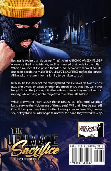 Betrayal is worse than slaughter. That's what ANTONIO AMEEN FELDER always instilled in his friends, and he honored that code to the fullest. When a murder at the prison threatens to incarcerate them all for life, one man decides to make THE ULTIMATE SACRIFICE to free the others. All he asks in return is for his family to be taken care of. KHADAFI is the leader of the recently freed trio. He takes his two friends, BOO and UMAR, on a ride through the streets of DC that they will never forget. Go on the journey with these three men as they make love and money, while trying not to forget the man they left behind. When one wrong move causes things to spiral out of control, can their bond survive the viciousness of the streets? Will their lives be spared? Or will their promises to each other be forgotten, as love, life, money, sex, betrayal and murder begin to unravel the bond they vowed to keep?