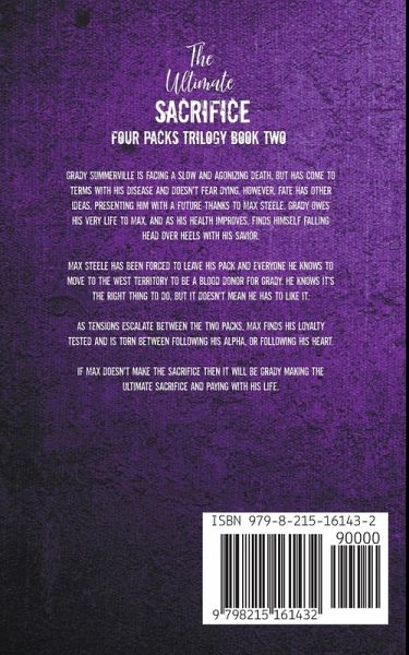 Grady Summerville is facing a slow and agonizing death, but has come to terms with his disease and doesn't fear dying. However, fate has other ideas, presenting him with a future thanks to Max Steele. Grady owes his very life to Max, and as his health improves, finds himself falling head over heels with his savior. Max Steele has been forced to leave his pack and everyone he knows to move to the West Territory to be a blood donor for Grady. He knows it's the right thing to do, but it doesn't mean he has to like it. As tensions escalate between the two packs, Max finds his loyalty tested and is torn between following his alpha, or following his heart. If Max doesn't make the sacrifice then it will be Grady making the ultimate sacrifice and paying with his life.