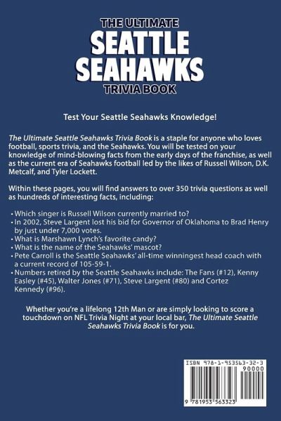Test Your Seattle Seahawks Knowledge! The Ultimate Seattle Seahawks Trivia Book is a staple for anyone who loves football, sports trivia, and the Seahawks. You will be tested on your knowledge of mind-blowing facts from the early days of the franchise, as well as the current era of Seahawks football led by the likes of Russell Wilson, D.K. Metcalf, and Tyler Lockett. Within these pages, you will find answers to over 350 trivia questions as well as hundreds of interesting facts, including: Which singer is Russell Wilson currently married to? In 2002, Steve Largent lost his bid for Governor of Oklahoma to Brad Henry by just under 7,000 votes. What is Marshawn Lynch's favorite candy? What is the name of the Seahawks' mascot? Pete Carroll is the Seattle Seahawks' all-time winningest head coach with a current record of 105-59-1. Numbers retired by the Seattle Seahawks include: The Fans (#12), Kenny Easley (#45), Walter Jones (#71), Steve Largent (#80) and Cortez Kennedy (#96). Whether you're a lifelong 12th Man or are simply looking to score a touchdown on NFL Trivia Night at your local bar, The Ultimate Seattle Seahawks Trivia Book is for you.