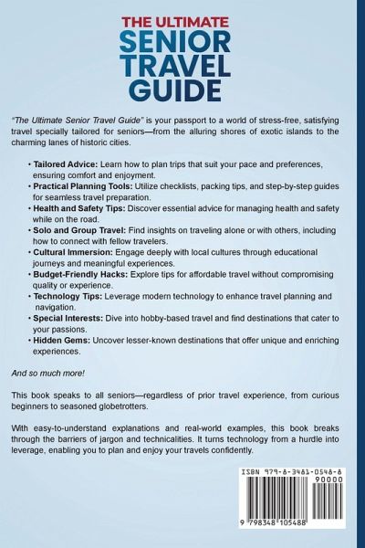Travel Fearlessly in Your Golden Years: Tips, Tricks, and Inspiring Stories Feeling overwhelmed by modern travel? The Ultimate Senior Travel Guide is your go-to resource for navigating the world with ease. Perfect for retirees looking to embark on new adventures, this guide provides practical advice and inspiration tailored specifically for senior travelers. Inside, you'll find: Stress-free travel tips and senior-friendly destinations for accessible, safe adventures Safety guidelines and budget strategies to maximize comfort without overspending Easy steps to navigate airports and public transportation, even if you're not tech-savvy How to manage health, mobility, and medications while on the move Inspiring stories from fellow senior travelers who've embraced life on the road Practical advice for using travel apps and technology without any tech headaches Smart packing tips to ensure comfort and peace of mind wherever you go Guidance on maximizing travel rewards and discounts to make your trips more affordable Worried about tech or first-time travel jitters? This guide breaks down everything you need to know in simple, easy-to-follow steps.