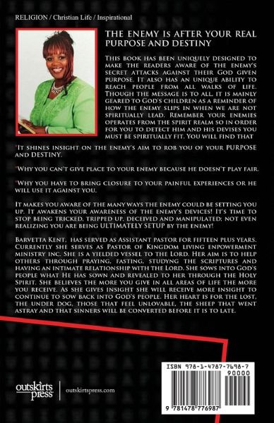 THE ENEMY IS AFTER YOUR REAL PURPOSE AND DESTINY... This book has been uniquely designed to make the readers aware of the enemy's secret attacks against their God given purpose. It also has a unique ability to reach people from all walks of life. Though the message is to all, it is mainly geared toward God's children as a reminder of how the enemy slips in when we are not spiritually lead. Remember your enemies operates from the spirit realm so in order for you to detect him and his devises you must be spiritually fit. You will find that: *It shines insight on the enemy's aim to rob you of your PURPOSE and DESTINY. *Why you can't give place to your enemy because he doesn't play fair. *Why you have to bring closure to your painful experiences or he will use it against you. It makes you aware of the many ways the enemy could be setting you up. It awakens your awareness of the enemy's devices! It's time to stop being tricked, tripped up, deceived and manipulated; not even realizing you are being ULTIMATELY SETUP by the enemy!