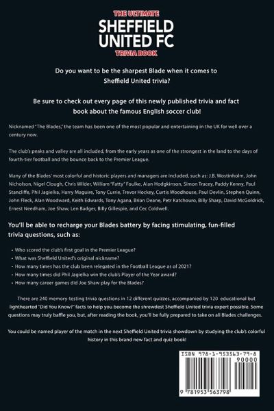 Do you want to be the sharpest Blade when it comes to Sheffield United trivia? Be sure to check out every page of this newly published trivia and fact book about the famous English soccer club! Nicknamed "The Blades," the team has been one of the most popular and entertaining in the UK for well over a century now. The club's peaks and valley are all included, from the early years as one of the strongest in the land to the days of fourth-tier football and the bounce back to the Premier League. Many of the Blades' most colorful and historic players and managers are included, such as: J.B. Wostinholm, John Nicholson, Nigel Clough, Chris Wilder, William "Fatty" Foulke, Alan Hodgkinson, Simon Tracey, Paddy Kenny, Paul Stancliffe, Phil Jagielka, Harry Maguire, Tony Currie, Trevor Hockey, Curtis Woodhouse, Paul Devlin, Stephen Quinn, John Fleck, Alan Woodward, Keith Edwards, Tony Agana, Brian Deane, Petr Katchouro, Billy Sharp, David McGoldrick, Ernest Needham, Joe Shaw, Len Badger, Billy Gillespie, and Cec Coldwell. You'll be able to recharge your Blades battery by facing stimulating, fun-filled trivia questions, such as: Who scored the club's first goal in the Premier League? What was Sheffield United's original nickname? How many times has the club been relegated in the Football League as of 2021? How many times did Phil Jagielka win the club's Player of the Year award? How many career games did Joe Shaw play for the Blades? There are 240 memory-testing trivia questions in 12 different quizzes, accompanied by 120 educational but lighthearted "Did You Know?" facts to help you become the shrewdest Sheffield United trivia expert possible. Some questions may truly baffle you, but, after reading the book, you'll be fully prepared to take on all Blades challenges. You could be named player of the match in the next Sheffield United trivia showdown by studying the club's colorful history in this amazing fact and quiz book!