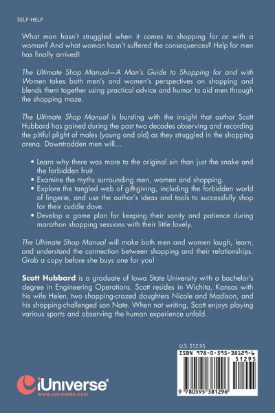 What man hasn't struggled when it comes to shopping for or with a woman? And what woman hasn't suffered the consequences? Help for men has finally arrived! The Ultimate Shop Manual-A Man's Guide to Shopping for and with Women takes both men's and women's perspectives on shopping and blends them together using practical advice and humor to aid men through the shopping maze. The Ultimate Shop Manual is bursting with the insight that author Scott Hubbard has gained during the past two decades observing and recording the pitiful plight of males (young and old) as they struggled in the shopping arena. Downtrodden men will Learn why there was more to the original sin than just the snake and the forbidden fruit. Examine the myths surrounding men, women and shopping. Explore the tangled web of gift-giving, including the forbidden world of lingerie, and use the author's ideas and tools to successfully shop for their cuddle dove. Develop a game plan for keeping their sanity and patience during marathon shopping sessions with their little lovely. The Ultimate Shop Manual will make both men and women laugh, learn, and understand the connection between shopping and their relationships. Grab a copy before she buys one for you!