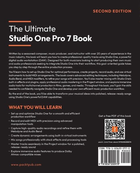 From first note to final master, your complete guide to transforming music production with Studio One Pro 7 Free with your book: DRM-free PDF version + access to Packt's next-gen Reader Key Features: - Eliminate technical barriers to create and arrange music effortlessly with Studio One's intuitive workflows - Produce professional-quality sound using built-in virtual instruments and effects without any additional software - Apply insider techniques and best practices to turn your recordings into radio-ready productions Book Description: Written by a seasoned composer, music producer, and instructor with over 20 years of experience in the music industry, this comprehensive guide transforms Studio One's powerful digital audio workstation (DAW) into your creative canvas. Designed for both musicians looking to start producing their own music and audio professionals integrating Studio One into their workflow, this hands-on manual takes you step-by-step through every stage of the production process. You'll learn how to set up Studio One for peak performance, create projects, record high-quality audio, and build MIDI arrangements with virtual instruments. The book covers advanced editing techniques, including Melodyne, Audio Bend, and MIDI modifiers, to refine your songs with precision. You'll master mixing with Studio One's built-in effects and plugins, apply professional audio mastering in the Project window, and explore immersive audio tools that bring your music to life in multichannel environments for films, gaming, and beyond. You'll not only develop technical proficiency but also a personalized, efficient music production workflow that serves your creative vision. By the final page, you'll have everything you need to turn musical ideas into polished, release-ready songs using only the Studio One software. What You Will Learn: - Set up and optimize Studio One for a smooth and efficient production workflow - Record and edit MIDI with precision using advanced manipulation tools - Capture high-quality audio recordings and refine them with Melodyne and Audio Bend - Create dynamic arrangements with Studio One's comprehensive suite of built-in virtual instruments - Mix songs like a professional using stock effects and processing tools - Master tracks seamlessly in the Project window for a polished, release-ready sound - Explore immersive audio features to produce Dolby Atmos-compatible mixes Who this book is for: This book is for music producers, composers, enthusiasts, or hobbyists who want to learn Studio One from the ground up and produce professional-quality music. Whether you're a beginner exploring your first digital audio workstation (DAW) or an experienced producer switching from another DAW, this guide will help you master Studio One's powerful tools and workflow. If you have basic knowledge of music production, this book will show you how to perform these tasks more efficiently and creatively in Studio One Pro 7. Table of Contents - Choosing Your Flavor of Studio One - Installing and Configuring Your Studio One Environment - Exploring the Studio One Environment - Creating a New Song - Recording Your First Audio Track - Adding Virtual Instruments and Recording MIDI - Editing and Rearranging Your Song - Editing Audio - Editing MIDI - Using Global Tracks - Preparing for the Mix - Working with Effects Plug-Ins to Craft a Mix - Optimizing Signal Flow and Elevating Your Mix - Working with Spatial Audio - Navigating the Project Page and Producing Final Masters - Using Additional Studio One Features