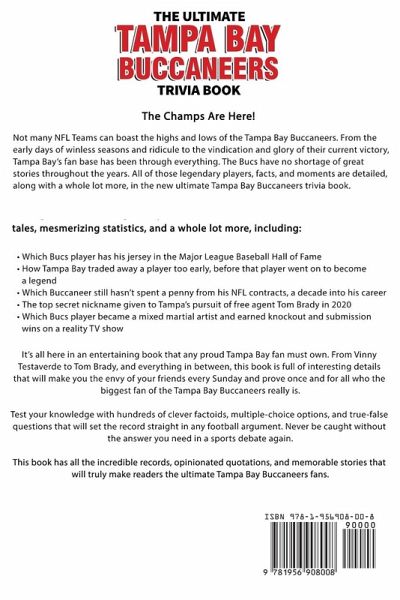 The Champs Are Here! Not many NFL Teams can boast the highs and lows of the Tampa Bay Buccaneers. From the early days of winless seasons and ridicule to the vindication and glory of their current victory, Tampa Bay's fan base has been through everything. The Bucs have no shortage of great stories throughout the years. All of those legendary players, facts, and moments are detailed, along with a whole lot more, in the new ultimate Tampa Bay Buccaneers trivia book. Throughout this thrilling read, you'll find hilarious anecdotes, behind-the-scenes tales, mesmerizing statistics, and a whole lot more, including: Which Bucs player has his jersey in the Major League Baseball Hall of Fame How Tampa Bay traded away a player too early, before that player went on to become a legend Which Buccaneer still hasn't spent a penny from his NFL contracts, a decade into his career The top secret nickname given to Tampa's pursuit of free agent Tom Brady in 2020 Which Bucs player became a mixed martial artist and earned knockout and submission wins on a reality TV show It's all here in an entertaining book that any proud Tampa Bay fan must own. From Vinny Testaverde to Tom Brady, and everything in between, this book is full of interesting details that will make you the envy of your friends every Sunday and prove once and for all who the biggest fan of the Tampa Bay Buccaneers really is. Test your knowledge with hundreds of clever factoids, multiple-choice options, and true-false questions that will set the record straight in any football argument. Never be caught without the answer you need in a sports debate again. This book has all the incredible records, opinionated quotations, and memorable stories that will truly make readers the ultimate Tampa Bay Buccaneers fans.