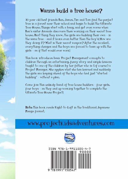10 year old best friends Ben, James, Tim & Tom find the perfect tree in a forest near their school and begin to build the Ultimate Tree House. Things start with a bang, and get even worse when Ben's sister Amanda discovers them working on their secret tree house. Next thing they know, the girls are building their own - in the same tree - and it looks even better than the boy's! How are they doing it? What is their secret weapon? After the accident, everything changes and the boys are forced to team up with the girls - as if that would ever work! This book introduces basic Project Management concepts to children through an entertaining, funny story and simple lessons taught to one of the children by her father who is (of course) a Project Manager. She applies what she has learned and suddenly the girls are leaping ahead of the boys who had just "started building" - without a plan. Come join this unlikely band of tree house builders - four girls, four boys - as they end up working together to complete the Ultimate Tree House Project! Note that this book reads Right-to-Left in traditional Manga format, as it is translated from the Japanese Manga back to English.
