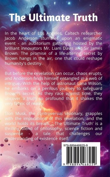 In the heart of Los Angeles, Caltech researcher Jacob Anderson stumbles upon an enigmatic event - an auditorium gathering hosted by the brilliant innovators Mr. Liam Davis and Sir James Brown. The promise of a life-altering secret by Brown hangs in the air, one that could reshape humanity's destiny. But before the revelation can occur, chaos erupts, and Anderson finds himself entangled in a web of intrigue. With the help of astronaut Lana Wilson, he embarks on a perilous journey to safeguard Brown's secret. As they race against time, they uncover a truth so profound that it shakes the very fabric of reality. Elon Musk, the controversial visionary, grapples with the implications of this revelation, and the world holds its breath. ' The Ultimate Truth' is a thrilling blend of philosophy, science fiction and suspense - a tale that challenges our understanding of existence itself.