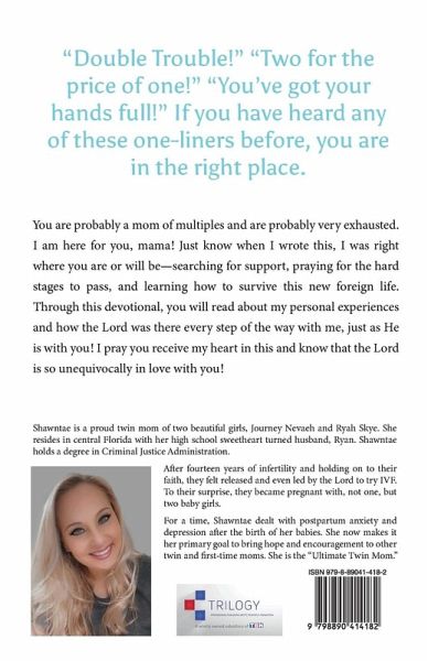 "Double Trouble!" "Two for the price of one!" "You've got your hands full!" If you have heard any of these one-liners before, you are in the right place. You are probably a mom of multiples and are probably very exhausted. I am here for you, mama! Just know when I wrote this, I was right where you are or will be - searching for support, praying for the hard stages to pass, and learning how to survive this new foreign life. Through this devotional, you will read about my personal experiences and how the Lord was there every step of the way with me, just as He is with you! I pray you receive my heart in this and know that the Lord is so unequivocally in love with you!