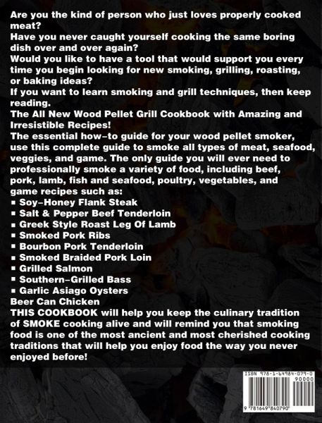 Are you the kind of person who just loves properly cooked meat? Have you never caught yourself cooking the same boring dish over and over again? Would you like to have a tool that would support you every time you begin looking for new smoking, grilling, roasting, or baking ideas? If you want to learn smoking and grill techniques, then keep reading. The All New Wood Pellet Grill Cookbook with Amazing and Irresistible Recipes! The essential how-to guide for your wood pellet smoker, use this complete guide to smoke all types of meat, seafood, veggies, and game. The only guide you will ever need to professionally smoke a variety of food, including beef, pork, lamb, fish and seafood, poultry, vegetables, and game recipes such as:¿Soy-Honey Flank Steak ¿Salt & Pepper Beef Tenderloin ¿Greek Style Roast Leg Of Lamb ¿Smoked Pork Ribs ¿Bourbon Pork Tenderloin ¿Smoked Braided Pork Loin ¿Grilled Salmon ¿Southern-Grilled Bass ¿Garlic Asiago Oysters Beer Can Chicken THIS COOKBOOK will help you keep the culinary tradition of SMOKE cooking alive and will remind you that smoking food is one of the most ancient and most cherished cooking traditions that will help you enjoy food the way you never enjoyed before!