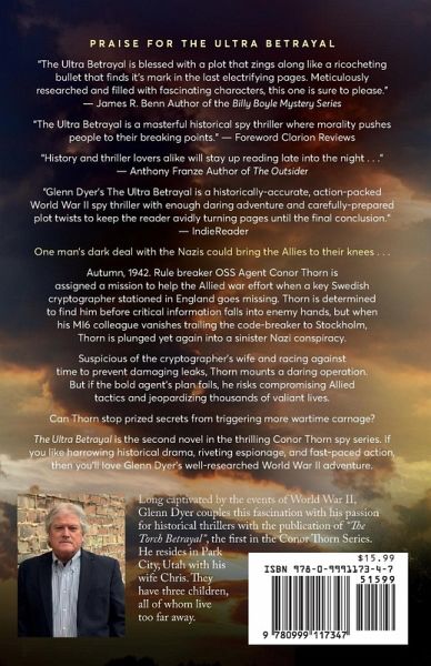 October, 1942. Rule breaker OSS Agent Conor Thorn is assigned a mission to help the Allied war effort when a key Swedish cryptographer stationed in England goes missing. Thorn is determined to find him before critical information falls into enemy hands. But his MI6 colleague, Emily Bright, vanishes trailing the codebreaker to Stockholm, plunging Thorn into a sinister Nazi conspiracy. Suspicious of the cryptographer's wife and racing against time to prevent damaging leaks, Thorn mounts a daring operation. But if the bold agent's plan fails, he risks compromising Allied tactics and jeopardizing thousands of valiant lives. Can Thorn stop prized secrets from triggering more wartime carnage? The Ultra Betrayal is the second novel in the thrilling Conor Thorn spy series. If you like harrowing historical drama, riveting espionage, and fast-paced action, then you'll love Glenn Dyer's well-researched World War II adventure.