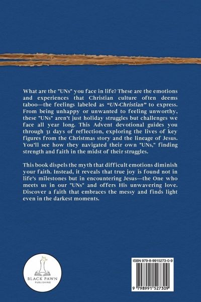 What are the "UNs" you face in life? These are the emotions and experiences that Christian culture often deems taboo, the feelings we're told are "UN-Christian" to express or even acknowledge. From feeling unhappy and unwanted to being unfiltered and unworthy, these "UNs" are not just seasonal struggles during the holidays but challenges we face throughout every stage of life. In this transformative Advent devotional, you'll explore these difficult emotions and discover that they do not diminish your faith or distance you from God-in fact, they are a part of the human experience that even biblical figures faced. Through 31 days of reflection, this book will take you on a journey through the lives of key characters from the Christmas story, the lineage of Jesus, and those who played pivotal roles in God's redemptive plan. You'll see how they navigated their own "UNs," often finding strength in the midst of their most vulnerable moments. By walking alongside these figures, you'll gain a deeper understanding that being Christian is not about having everything perfectly together, but about embracing the messy, the difficult, and the "UNs" with faith and trust in Jesus. This Advent, challenges the myths that have held you back from fully experiencing the depth of God's love. Let this devotional guide you to the truth that true joy is not found in life's milestones or in meeting others' expectations, but in encountering Jesus-the One who doesn't shy away from our "UNs" but meets us right where we are. Discover a faith that is honest, resilient, and rooted in the person of Christ, who brings light into the darkest corners of our lives.