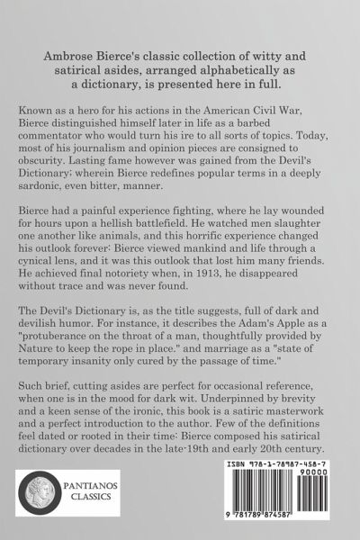 Ambrose Bierce's classic collection of witty and satirical asides, arranged alphabetically as a dictionary, is presented here in full. Known as a hero for his actions in the American Civil War, Bierce distinguished himself later in life as a barbed commentator who would turn his ire to all sorts of topics. Today, most of his journalism and opinion pieces are consigned to obscurity. Lasting fame however was gained from the Devil's Dictionary; wherein Bierce redefines popular terms in a deeply sardonic, even bitter, manner. Bierce had a painful experience fighting, where he lay wounded for hours upon a hellish battlefield. He watched men slaughter one another like animals, and this horrific experience changed his outlook forever: Bierce viewed mankind and life through a cynical lens, and it was this outlook that lost him many friends. He achieved final notoriety when, in 1913, he disappeared without trace and was never found. The Devil's Dictionary is, as the title suggests, full of dark and devilish humor. For instance, it describes the Adam's Apple as a "protuberance on the throat of a man, thoughtfully provided by Nature to keep the rope in place." and marriage as a "state of temporary insanity only cured by the passage of time." Such brief, cutting asides are perfect for occasional reference, when one is in the mood for dark wit. Underpinned by brevity and a keen sense of the ironic, this book is a satiric masterwork and a perfect introduction to the author. Few of the definitions feel dated or rooted in their time: Bierce composed his satirical dictionary over decades in the late-19th and early 20th century. Later writers such as H. L. Mencken admired and took inspiration from Bierce's many barbs, and he remains admired to this day.