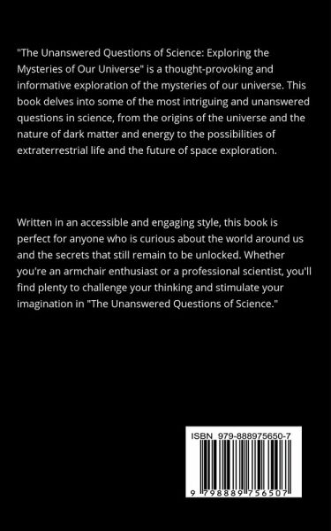 ""The Unanswered Questions of Science: Exploring the Mysteries of Our Universe"" is a thought-provoking and informative exploration of the mysteries of our universe. This book delves into some of the most intriguing and unanswered questions in science, from the origins of the universe and the nature of dark matter and energy to the possibilities of extraterrestrial life and the future of space exploration. Written in an accessible and engaging style, this book is perfect for anyone who is curious about the world around us and the secrets that still remain to be unlocked. Whether you're an armchair enthusiast or a professional scientist, you'll find plenty to challenge your thinking and stimulate your imagination in ""The Unanswered Questions of Science.""