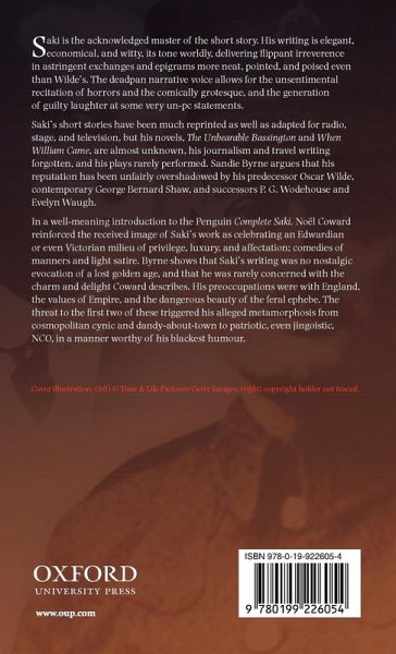 Saki is the acknowledged master of the short story. His writing is elegant, economical, and witty, its tone worldly, flippant irreverence delivered in astringent exchanges and epigrams more neat, pointed, and poised even than Wilde's. The deadpan narrative voice allows for the unsentimental recitation of horrors and the comically grotesque, and the generation of guilty laughter at some very un-pc statements. Saki's short stories have been much reprinted as well as adapted for radio, stage, and television, but his novels, The Unbearable Bassington and When William Came, are almost unknown, his journalism and travel writing forgotten, and his plays rarely performed. Sandie Byrne argues that his reputation has been unfairly overshadowed by his predecessor Oscar Wilde, contemporary George Bernard Shaw, and successors P.G. Wodehouse and Evelyn Waugh. In a well-meaning introduction to the Penguin Complete Saki, Noël Coward reinforced the received image of Saki's work as celebrating an Edwardian or even Victorian milieu of privilege, luxury, and affectation; comedies of manners and light satire. Byrne shows that Saki's writing was no nostalgic evocation of a lost golden age, and that he was rarely concerned with the charm and delight Coward describes. His preoccupations were with England, the values of Empire, and the dangerous beauty of the feral ephebe. The threat to the first two of these triggered his alleged metamorphosis from cosmopolitan cynic and dandy-about-town to patriotic, even jingoistic, NCO, in a manner worthy of his blackest humour.