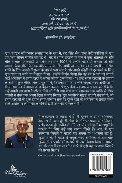 Most people live in America today have a story to tell about their heritage because primarily, this is a nation of immigrants. All of these stories are different with diverse experiences, both pleasant and not so pleasant. Nan Singh, a grandchild of an immigrant from Punjab, who lives in California now, comes to know unexpectedly some shocking information about the life of his grandfather who was born in India and then migrated to the United States through Canada. The information he got bothered him tremendly. He embarked on a physical and mental journey to determine whether the information he had learned was actually true. This is the story of that journey. His grandfather started his new life outside India started in Vancouver Canada then came to America. Sikh immigrants from India mainly from Punjab started to leave India for other countries at the end of the eighteenth century.