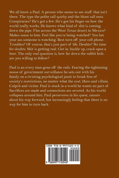 We all know a Paul. A person who seems to see stuff that isn’t there. The type the polite call quirky and the blunt call nuts. Conspiracies? He’s got a few. He’s got his finger on how the world really works. He knows what kind of shit is coming down the pipe. Flee across the West Texas desert to Mexico? Makes sense to him. Feel like you’re being watched? You bet your ass someone is watching. Best turn off your cell phone. Troubles? Of course, that’s just part of life. Doubts? No time for doubts. Shit is getting real. Get in, buckle up, crack open a beer. The only real question is, how far down the rabbit hole are you willing to follow? Paul is an every man gone off the rails. Fearing the tightening noose of government surveillance he sets out with his family on a twisting psychological jaunt to break free of society's restrictions, no matter what the cost. Hero and villain. Culprit and victim. Paul is stuck in a world he wants no part of. Sacrifices are made and connections are severed. As his world collapses around him, Paul perseveres in his quest, unsure about his way forward, but increasingly feeling that there is no way for him to turn back.